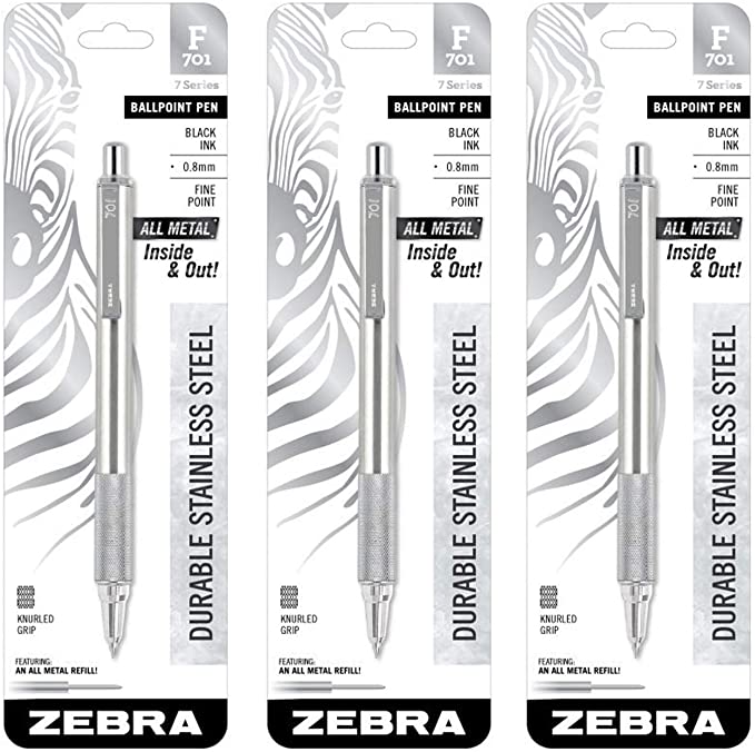 3 - Zebra F-701 Ballpoint Pens. Stainless Steel with Knurled Grip. Pk of 3 Pens
